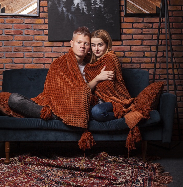 Mantas: lana merina o mezcla con acrílico suave; dobladas sobre el brazo curvo del sofá.